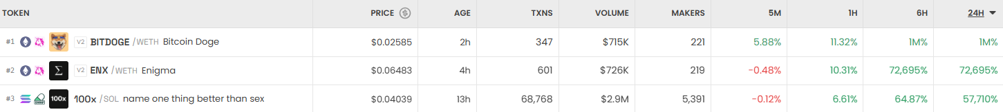 하루 동안 DEX에서 가장 크게 오른 거래쌍은 BITDoge/WETH(Bitcoin Doge)로 24시간 기준 100만 % 상승하며 0.02585달러에 거래됐다. ENJX/WETH(Enigma)는 72,695% 상승한 0.06483달러에 거래되며 상위권에 올랐다. 이어 100x/SOL(name one thing better than sex)은 0.04039달러로 24시간 기준 57,710% 올랐다.