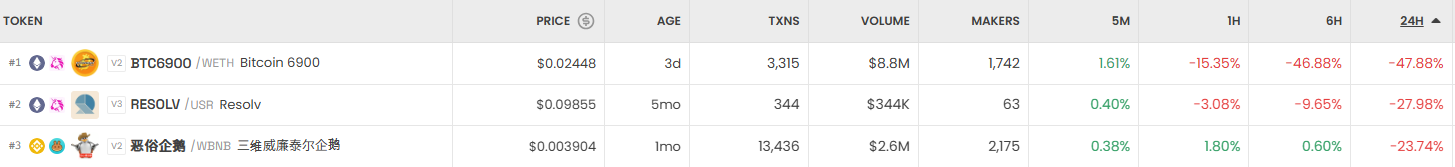 반면 가장 크게 하락한 거래쌍은 BTC6900/WETH(Bitcoin 6900)으로, 24시간 기준 47.88% 급락하며 0.02448달러에 거래됐다. 이어 RESOLV/USR(Resolv)이 27.98% 떨어졌고, 三维威康泰尔企羸/WBNB는 24시간 기준 23.74% 하락하며 0.003904달러에 거래됐다.