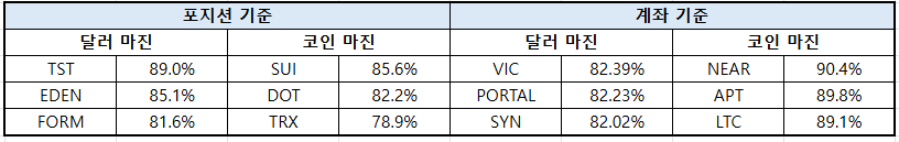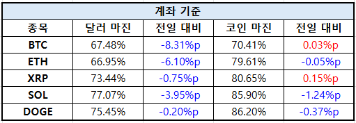 계좌 기준에서 비트코인은 달러 마진 67.48%(–8.31%p), 코인 마진 70.41%(+0.03%p)를 기록했다. 달러 마진 비중 감소 폭이 컸다.