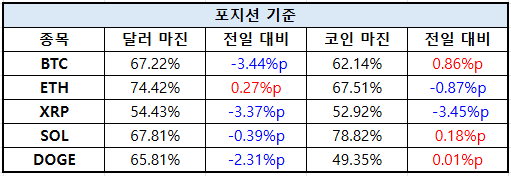 반면 XRP는 달러 마진 54.43%(–3.37%p), 코인 마진 52.92%(–3.45%p)로 두 시장에서 모두 하락하며 주요 자산 중 가장 약한 흐름을 나타냈다.