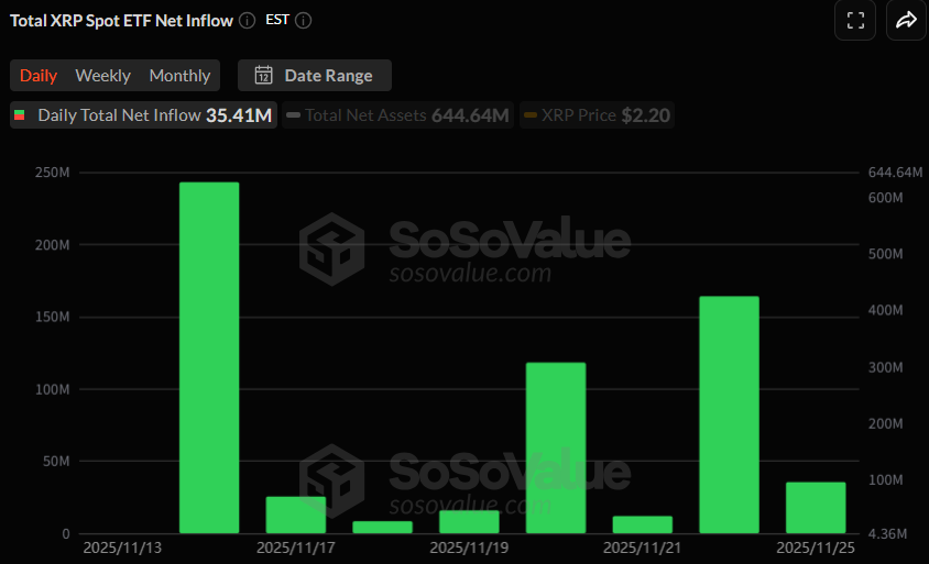 총 거래대금은 3812만 달러로 집계됐으며, 전일(4376만 달러) 대비 감소했다. 총 순자산 규모는 6억7649만 달러로, XRP 전체 시가총액 대비 약 0.50%에 해당한다.
