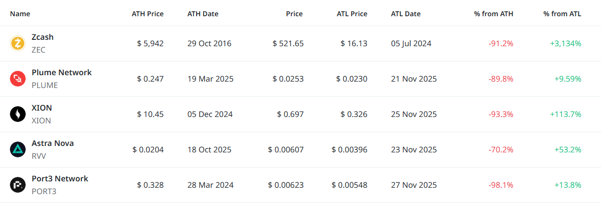 총 5개 종목이 신저점을 기록하거나 저점 부근에서 움직이는 것으로 집계됐다. 전체 종목이 저점 대비 강한 반등을 시도한 종목과 여전히 부진한 종목으로 나뉘며, 단기 변동성이 크게 확대되는 흐름을 보였다. 특히 일부 자산은 ATL 대비 두 자릿수 반등폭을 보이며 매수세 유입 조짐도 나타나고 있다.