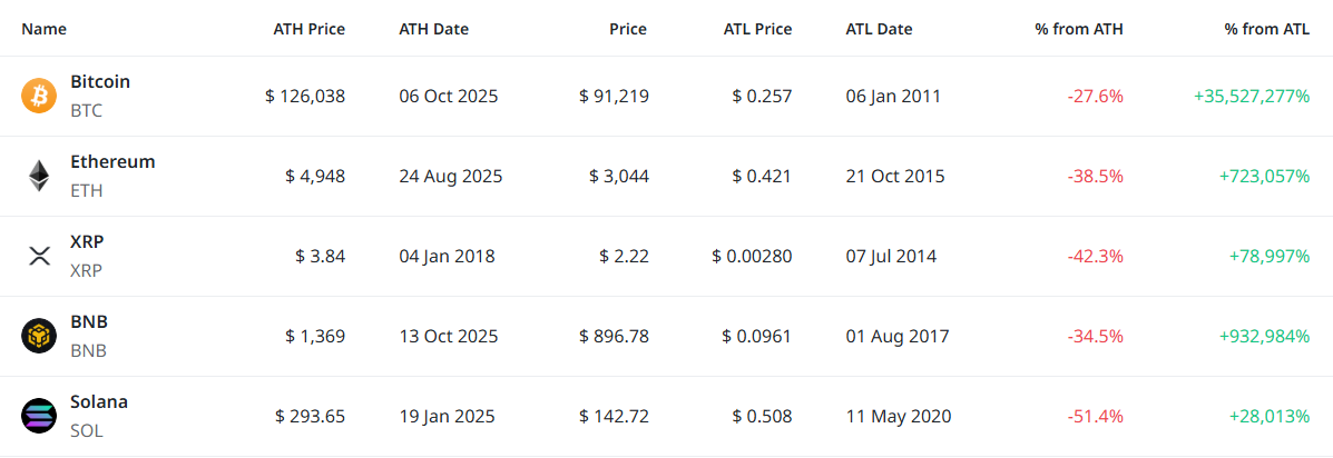 [편집자주] 암호화폐 시장은 하루 새 고점과 저점이 빠르게 바뀌는 고변동성 환경이다. 역대 최고가(ATH)와 역대 최저가(ATL) 경신 종목을 추적하면 강세와 약세 흐름을 조기에 포착할 수 있다. 크립토랭크 기준 시가총액 1000만 달러 이상 종목 중 하루 사이 고점 또는 저점을 경신한 주요 토큰을 정리하고 시가총액 상위 종목과 실시간 국내 인기 자산의 고점 대비 조정률을 함께 분석해 시장 회복 여력과 흐름을 진단한다.