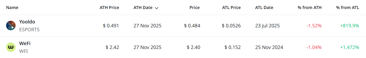 두 종목 모두 11월 27일자로 새로운 신고점을 기록한 뒤 소폭 조정을 받는 흐름을 보였다. 율두는 단기 차익 실현으로 1%대 조정이 나타났으나 상승 추세는 유지되고 있으며, 위파이 역시 강한 신고점 돌파 이후 가벼운 되돌림 구간에 진입했다. 전반적으로 상위 종목들은 신고점 근처에서 거래되며 단기 모멘텀과 투자심리가 견조한 모습을 보이고 있다.