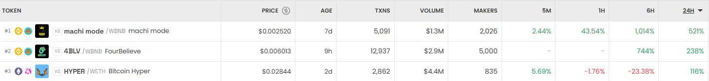 하루 동안 DEX에서 가장 크게 오른 거래쌍은 machi mode/WBNB(machi mode)로 24시간 기준 521% 상승하며 0.002520달러에 거래되고 있다. 이어 4BLV/WBNB(FourBelieve)는 전일 대비 238%, HYPER/WETH(Bitcoin Hyper)는 116% 상승했다.