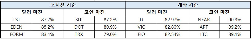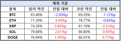 계좌 기준에서는 강약 대비가 더욱 뚜렷했다. 비트코인은 달러 마진 65.48%(–2.00%p), 코인 마진 69.29%(–1.12%p)로 두 기준 모두에서 하락했다.