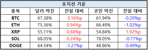솔라나는 달러 마진 79.68%(+2.61%p), 코인 마진 86.80%(+0.90%p)로 계좌 기준에서도 가장 강한 롱 축을 형성했다. 도지코인은 달러 마진 76.94%(+1.49%p), 코인 마진 86.91%(+0.71%p)로 완만한 증가세를 보였다.