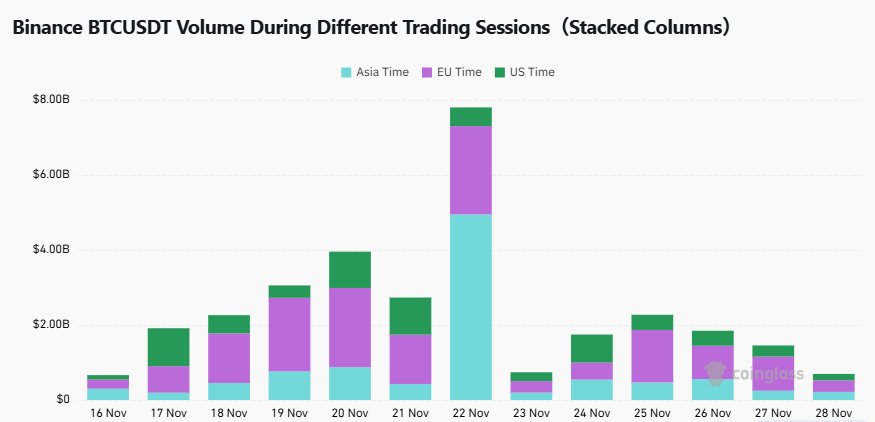 바이낸스 BTCUSDT 거래량은 아시아 시간대 2억1597만 달러, 유럽 시간대 3억0840만 달러, 미국 시간대 1억7106만 달러로 집계됐다.