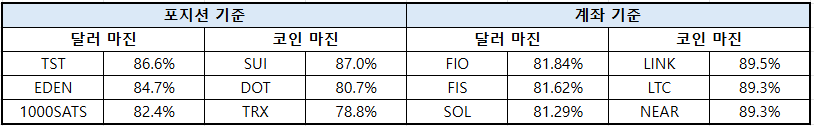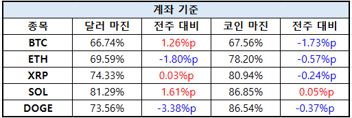 계좌 기준에서는 강약 대비가 더욱 뚜렷했다. 비트코인은 달러 마진 66.74%(+1.26%p), 코인 마진 67.56%(–1.73%p)로 시장별 엇갈림이 있었다. 이더리움은 달러 마진 69.59%(–1.80%p), 코인 마진 78.20%(–0.57%p)로 두 기준 모두에서 하락했다.
