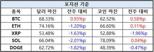 도지코인은 달러 마진 73.56%(–3.38%p), 코인 마진 86.54%(–0.37%p)로 완만한 감소세를 보였다.