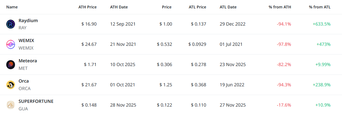 [편집자주] 암호화폐 시장은 하루 새 고점과 저점이 빠르게 바뀌는 고변동성 환경이다. 역대 최고가(ATH)와 역대 최저가(ATL) 경신 종목을 추적하면 강세와 약세 흐름을 조기에 포착할 수 있다. 크립토랭크 기준 시가총액 1000만 달러 이상 종목 중 하루 사이 고점 또는 저점을 경신한 주요 토큰을 정리하고 시가총액 상위 종목과 실시간 국내 인기 자산의 고점 대비 조정률을 함께 분석해 시장 회복 여력과 흐름을 진단한다.