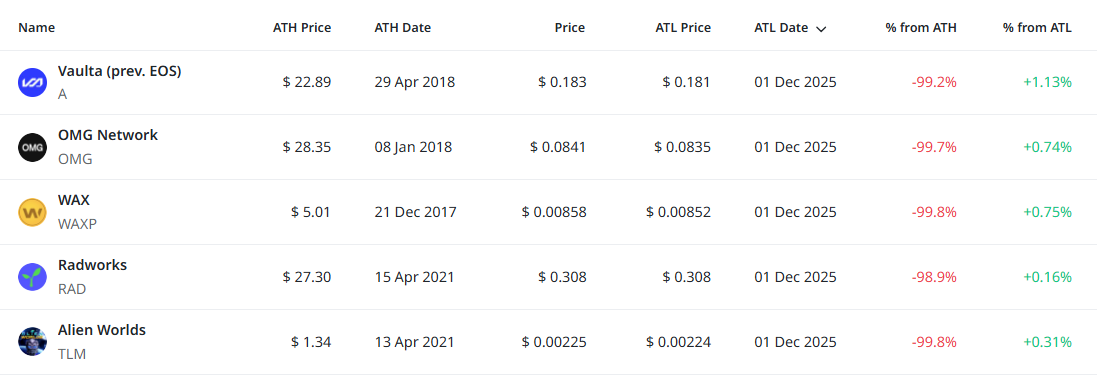 상위 5개 종목은 래드웍스(RAD)가 신저점(ATL)을 경신했으며, 나머지 4개 종목(VAULTA, OMG, WAXP, TLM) 역시 ATL 대비 현재 가격의 상승률이 0.31%에서 1.13%에 불과해 사실상 신저점 부근에 머물러 있는 것으로 나타났다. 이들 종목의 공통적인 추세는 과거 ATH 대비 98% 이상 급락한 상태에서 극심한 매도 압력과 유동성 부족에 직면해 있다는 점이다. 이는 시장에서 관심이 크게 멀어진 '리스크 종목'으로 분류될 수 있으며, 투자자들에게는 극단적인 변동성과 청산 위험에 대한 각별한 주의가 요구된다.