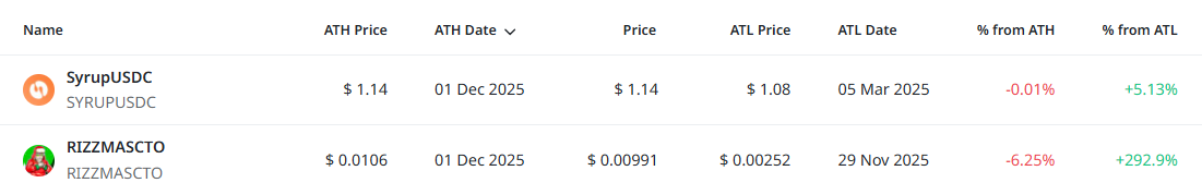 상위 5개 종목(SyrupUSDC, RIZZMASCTO 포함) 중에서 SyrupUSDC는 현재 가격이 ATH와 거의 일치하며 신고가 경신 직전에 있음을 확인했다. RIZZMASCTO 역시 ATH 대비 하락률이 6.25%에 불과해 강력한 상승 탄력을 유지하고 있는 것으로 나타났다. 이는 시장의 위험 선호 심리가 강하게 작용하며, 유동성이 얇은 소규모 알트코인에 자금이 집중되는 '쏠림 현상'이 나타나고 있음을 의미한다. 이러한 종목들은 단기적인 급등세를 보이지만, 급격한 가격 변동성으로 인해 투자에 높은 주의가 요구된다.