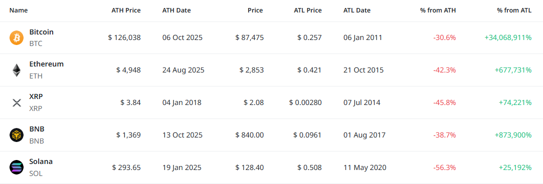 현재가 8만7475달러 | ATH 126,038달러 (–30.6%)