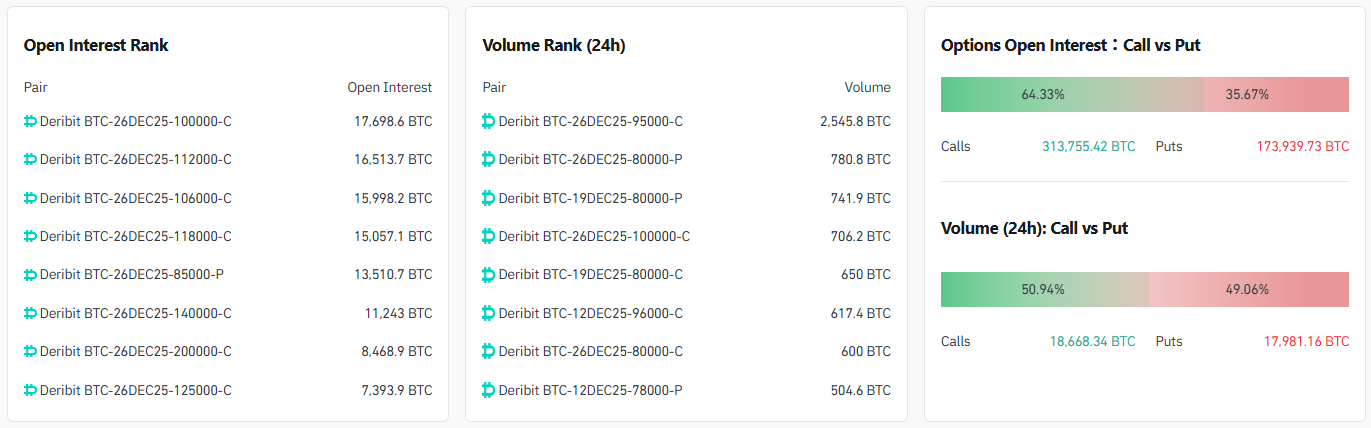 24시간 거래량 기준 상위 계약은 ▲9만5000달러 콜옵션(12월 26일) ▲8만5000달러 풋옵션(12월 26일) ▲8만 달러 풋옵션(12월 19일) 순으로 나타나 고행사가 콜옵션 중심의 미결제약정과 달리 단기 거래량에서는 시장의 하방 리스크에 대비하는 풋옵션 거래가 활발하게 나타났다.