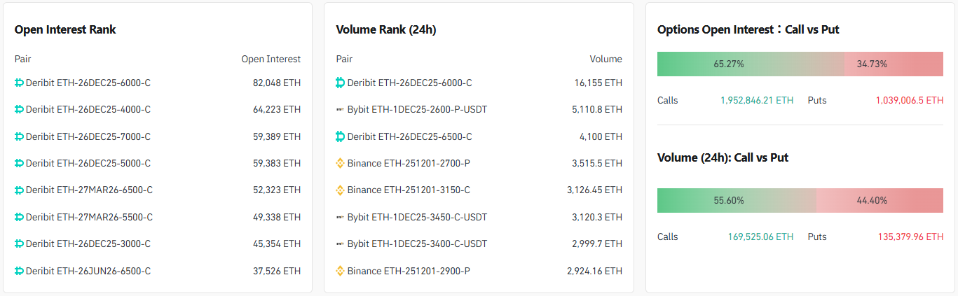 24시간 거래량 기준 상위 계약은 ▲6000달러 콜옵션(12월 26일 만기) ▲2600달러 풋옵션(12월 26일 만기) ▲4500달러 콜옵션(12월 26일 만기) 순으로 나타났으며 단기 거래에서는 6000달러 고행사 콜옵션과 함께 2600달러 풋옵션이 2위에 오르며 특정 가격대 중심의 변동성 베팅이 강하게 나타났다.