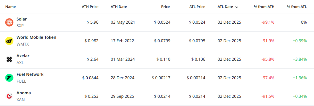 이 외에도 ▲화이트록(WHITE) ▲USdz(USDZ) ▲아레나Z(A2Z) ▲네온(N3ON) ▲베라BTC볼트토큰(BVT) 등이 집계됐다. 전체 10개 종목이 신저점을 경신했으며, 다수 프로젝트가 단기적으로 하방 압력을 피하지 못한 모습이다. 스테이블 연동형 자산부터 인프라·웹3 생태계 기반 토큰까지 폭넓게 분포한 점은 시장 전반의 약세 심리를 반영한다.