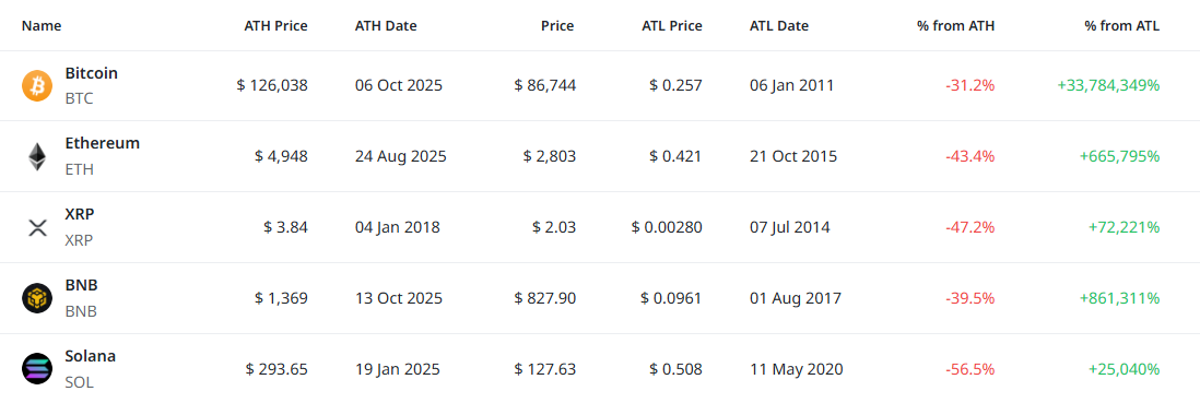 현재가 86744달러 | ATH 126038달러 (–31.2%)