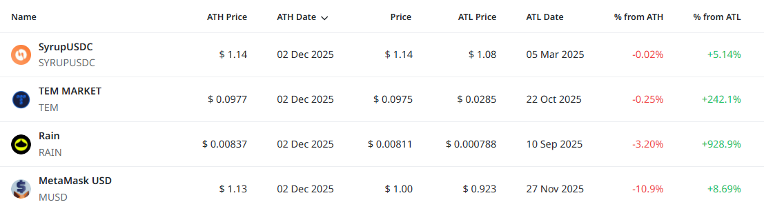 이번 집계에서는 시럽USDC, 템마켓, 레인, 메타마스크USD 등 총 4개 종목이 신규 신고가를 기록한 것으로 나타났다. 스테이블 자산부터 중소형 알트코인까지 다양한 종목이 고점을 경신하며 시장 내 단기 상승 모멘텀을 반영했다. 특히 레인(RAIN)은 직전 저점 대비 큰 폭의 회복세를 보이며 투자자 관심을 끌었다.