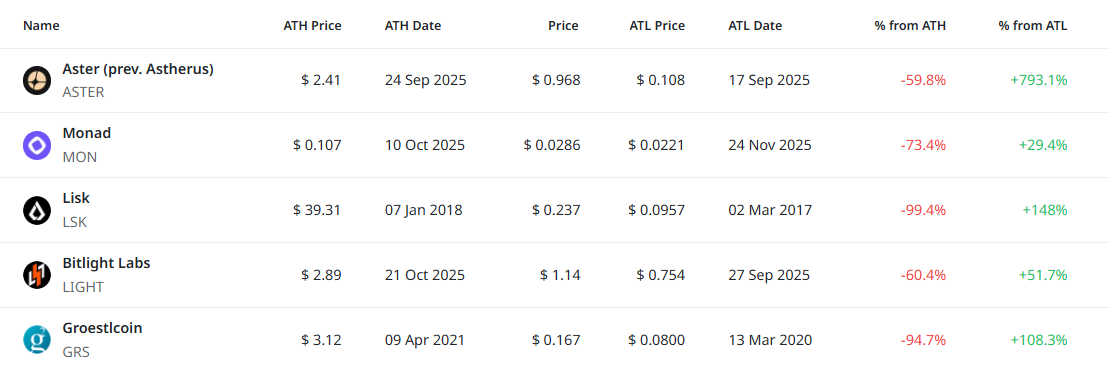 [편집자주] 암호화폐 시장은 하루 새 고점과 저점이 빠르게 바뀌는 고변동성 환경이다. 역대 최고가(ATH)와 역대 최저가(ATL) 경신 종목을 추적하면 강세와 약세 흐름을 조기에 포착할 수 있다. 크립토랭크 기준 시가총액 1000만 달러 이상 종목 중 하루 사이 고점 또는 저점을 경신한 주요 토큰을 정리하고 시가총액 상위 종목과 실시간 국내 인기 자산의 고점 대비 조정률을 함께 분석해 시장 회복 여력과 흐름을 진단한다.