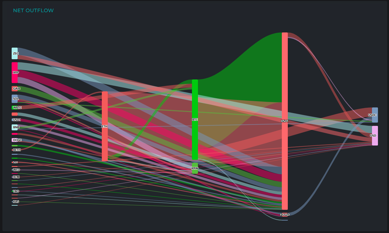 SOL에서는 총 2520만 달러의 유출이 발생했으며 ▲USDT 1350만 달러 ▲KRW 480만 달러 ▲FDUSD 370만 달러 ▲USDC 320만 달러로 흘렀다.
