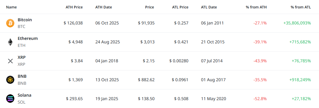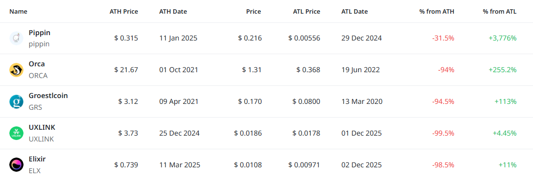 [편집자주] 암호화폐 시장은 하루 새 고점과 저점이 빠르게 바뀌는 고변동성 환경이다. 역대 최고가(ATH)와 역대 최저가(ATL) 경신 종목을 추적하면 강세와 약세 흐름을 조기에 포착할 수 있다. 크립토랭크 기준 시가총액 1000만 달러 이상 종목 중 하루 사이 고점 또는 저점을 경신한 주요 토큰을 정리하고 시가총액 상위 종목과 실시간 국내 인기 자산의 고점 대비 조정률을 함께 분석해 시장 회복 여력과 흐름을 진단한다.
