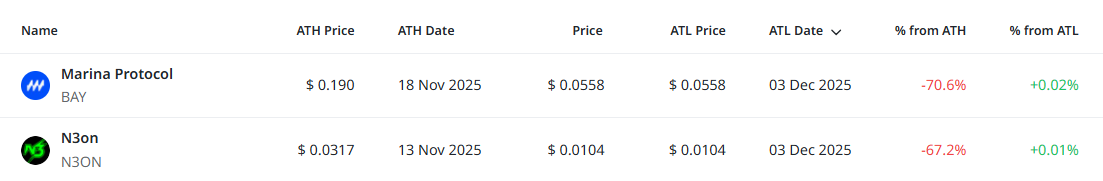 마리나 프로토콜과 네온 두 종목이 동시에 신저점을 기록한 것으로 나타났다. 두 토큰 모두 최근 가격이 ATL 수준에서 사실상 멈춰 있으며, 단기 매도 압력이 극도로 강화된 상황을 반영한다. 신저점 경신 이후 반등 폭은 제한적이어서 시장 참여자들의 위험회피 심리가 여전히 우세한 흐름이 지속되고 있다.