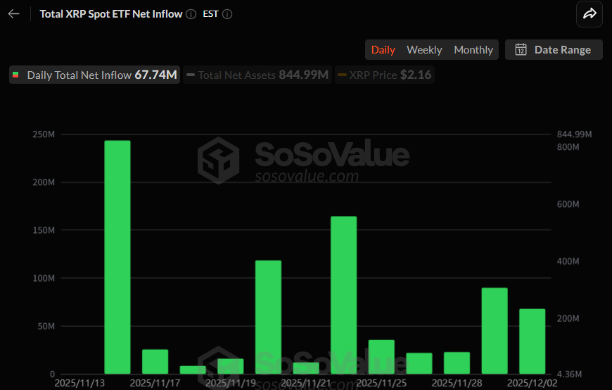 XRP 현물 ETF 시장에서는 총 6774만 달러 규모의 순유입이 발생했다.