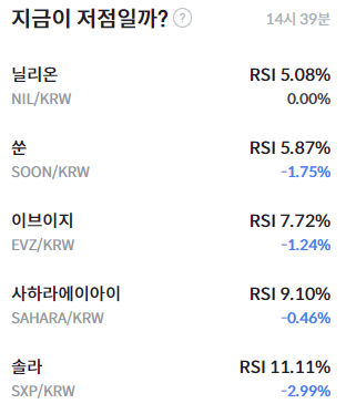 한편 14시 39분 기준 빗썸 상대강도지수(RSI)에서는 닐리온(NIL)이 RSI 5.08%(±0.00%)로 가장 낮은 수준을 기록했다. 이어 쑨(SOON)은 5.87%(-1.75%), 이브이지(EVZ)는 7.72%(-1.24%), 사하라이에이아이(SAHARA)는 9.10%(-0.46%), 솔라(SXP)는 11.11%(-2.99%)로 나타났다. RSI가 10% 내외까지 내려간 종목들이 다수 포착되며 단기 과매도 신호가 강하게 형성된 구간으로 해석된다.