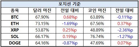 도지코인(DOGE)은 달러 마진 75.38%(+4.97%p), 코인 마진 86.31%(–0.01%p)로 달러 마진이 큰 폭으로 증가하며 두드러진 매수세를 보였다.