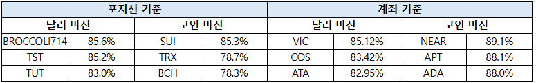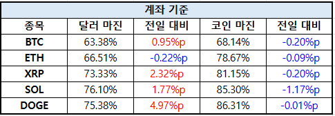 계좌 기준에서는 종목별로 강한 편차가 나타났다. 비트코인(BTC)은 달러 마진 63.38%(+0.95%p), 코인 마진 68.14%(–0.20%p)로 소폭 혼조세를 보였다. 이더리움(ETH)은 달러 마진 66.51%(–0.22%p), 코인 마진 78.67%(–0.09%p)로 양쪽 모두 약화됐다.