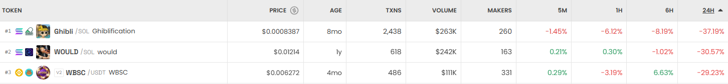 반면 가장 크게 하락한 거래쌍은 Ghibli/SOL(Ghiblification)으로 24시간 기준 –37.19%, 가격 0.0008387달러로 하락했다. WOULD/SOL 역시 –30.57%, WBSC/USDT는 –29.23%로 큰 폭의 조정을 겪었다.