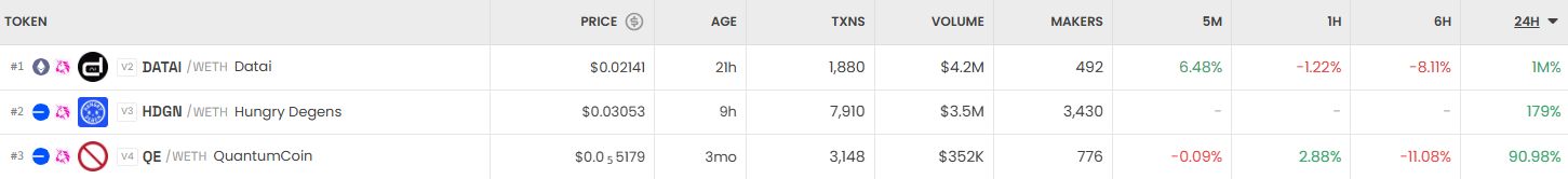 가장 크게 오른 거래쌍은 이더리움 기반 DATAI/WETH(Datai)이다. 24시간 기준 100만 % 상승, 가격 0.02141달러로 기록했다. bibi/WBNB (Binance bibi)로, 24시간 기준 523% 급등하며 0.0003283달러에 거래 중이다. 이어 Franinu/WBNB (Franklin The Inu)는 614.5만 달러의 거래량과 함께 상위권을 형성했다.