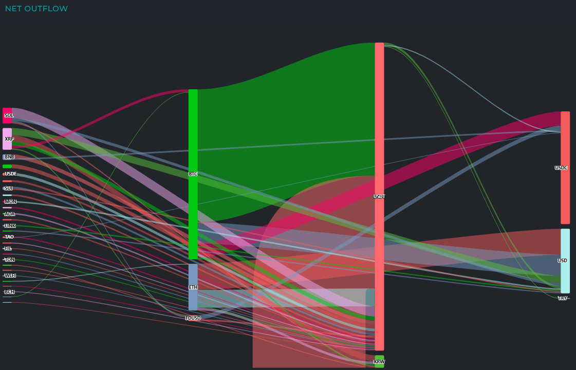 SOL에서는 총 4030만 달러가 유출되며 2640만 달러가 USDT로 이동했고 일부는 USD·FDUSD·KRW 등으로 분산됐다.