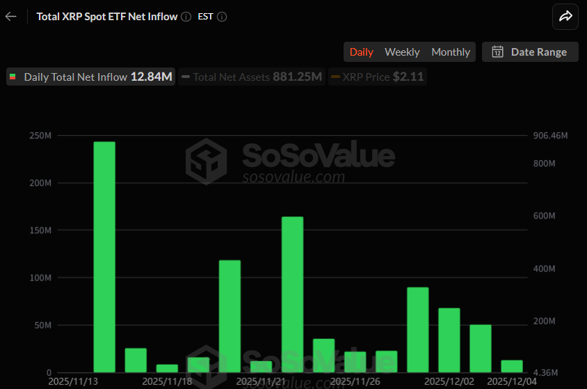 XRP 현물 ETF 시장에서는 총 1284만 달러 규모의 순유입이 발생했다.