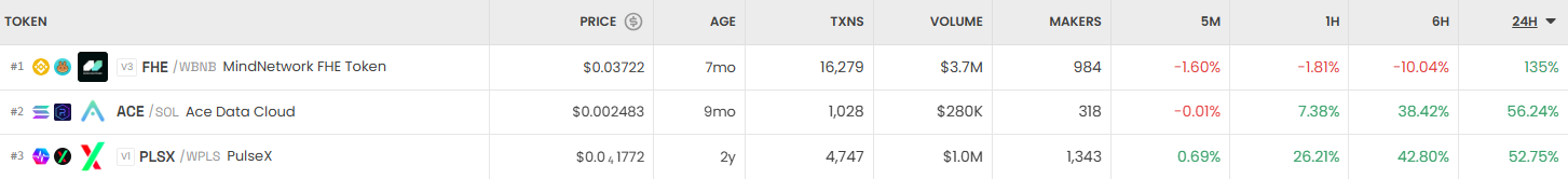 가장 크게 오른 거래쌍은 이더리움 기반 FHE/WBNB(MindNetwork FHE Token)이다. 24시간 기준 135% 상승, 가격 0.03722달러로 기록됐다. 이어 ACE/SOL(Ace Data Cloud)은 56.24% 상승하며 0.002483달러에 거래됐고, PLSX/WPLS(PulseX)는 52.75% 오르며 0.04172달러를 나타냈다.