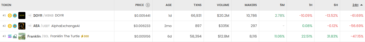 반면 가장 크게 하락한 거래쌍은 DOYR/WBNB(DOYR)으로 24시간 기준 –61.69%, 가격 0.005441달러로 조정받았다. AEA/USDT(AlphaExchangeAI) 역시 –56.69%를 기록했고, Franklin/SOL(Franklin The Turtle)은 –47.15%로 큰 폭의 하락세를 보였다.