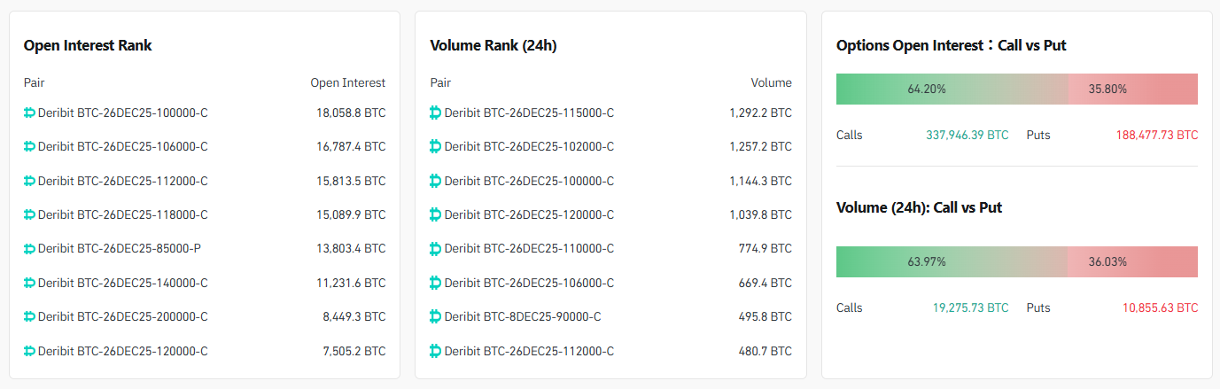 가장 많은 미결제약정이 몰린 계약은 ▲10만 달러 콜옵션(12월 26일) ▲10만6000달러 콜옵션(12월 26일) ▲11만2000달러 콜옵션(12월 26일) 순이었다.