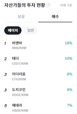 빗썸 집계에 따르면 비앤비가 매수 비중 18%로 가장 높은 수치를 기록했다. 테더는 10%로 뒤를 이었으며, 이더리움과 도지코인은 각각 8%, 헤데라는 7%를 기록하며 상위권에 이름을 올렸다. 메이저 코인과 스테이블코인을 중심으로 한 매수 흐름이 이어지고 있는 모습이다.