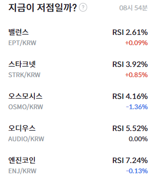 이 외에도 스타크넷(STRK), 오스모시스(OSMO), 오디우스(AUDIO), 엔진코인(ENJ) 등이 RSI 30 이하의 과매도 구간에 머물고 있다. 특히 밸런스와 스타크넷은 RSI가 한 자릿수 초반에 형성되며 단기 기술적 반등 가능성이 거론되고 있다.