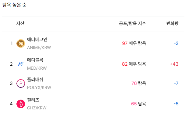 공포·탐욕 지수 상위권에는 메디블록(MED), 폴리매쉬(POLYX), 칠리즈(CHZ) 등이 함께 포함됐다. 특히 메디블록은 탐욕지수 82포인트로 뒤를 이었으며, 전일 대비 지수 상승 폭이 크게 나타났다.