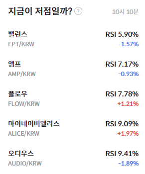 이 외에도 앰프(AMP), 플로우(FLOW), 마이네이버앨리스(ALICE), 오디우스(AUDIO) 등 다수 종목이 RSI 30 이하의 과매도 구간에 머물고 있다. 특히 밸런스와 앰프는 RSI가 한 자릿수 수준에 근접하며 단기 기술적 반등 가능성이 거론된다.