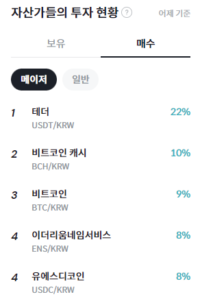 빗썸 집계에 따르면 테더가 22%로 가장 높은 매수 비중을 기록했다. 이어 비트코인 캐시가 10%, 비트코인이 9%를 기록했으며, 이더리움네임서비스(ENS)와 유에스디코인(USDC)은 각각 8%로 뒤를 이었다. 스테이블코인과 대형 시가총액 종목 중심의 매수 흐름이 이어지는 모습이다.