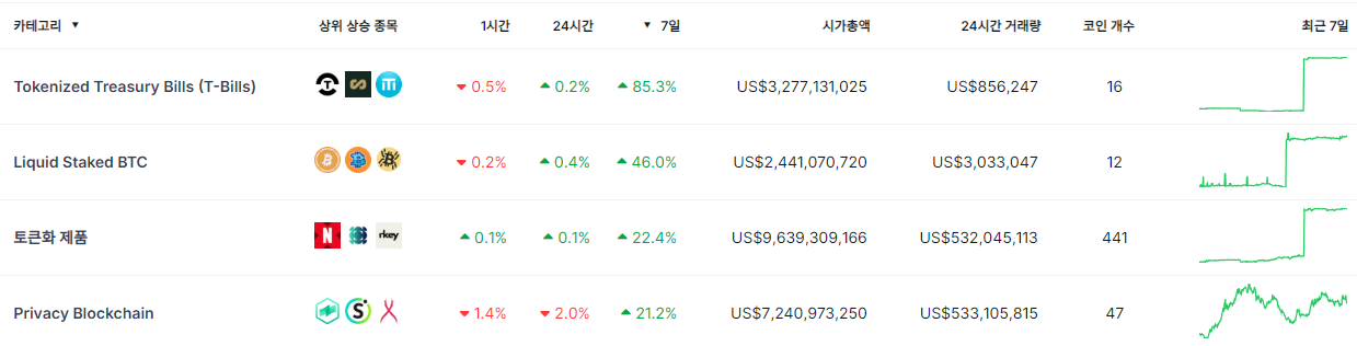 최근 7일간 토큰화 미 국채(Tokenized Treasury Bills, T-Bills) 카테고리가 85.3% 상승하며 코인게코(CoinGecko) 기준 전체 카테고리 중 가장 높은 상승률을 기록했다. 리퀴드 스테이킹 비트코인(46.0%), 토큰화 제품(22.4%), 프라이버시 블록체인(21.2%) 카테고리도 두 자릿수 상승률을 보이며 전반적인 온체인 실물자산(RWA) 및 인프라 섹터 강세 흐름이 이어졌다.