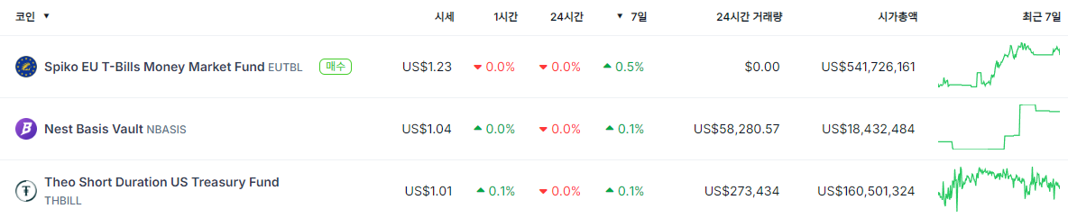 Spiko EU T-Bills Money Market Fund(EUTBL): 최근 7일간 0.5% 상승했다. 현재가는 1.23달러이며, 24시간 거래량은 없고 시가총액은 5억 4,172만 달러를 기록했다.