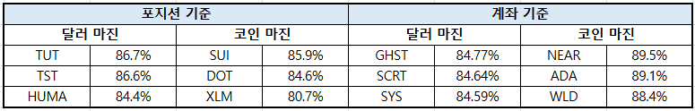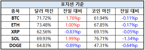 솔라나(SOL)는 달러 마진 69.93%로 1.99%포인트 상승했으나, 코인 마진은 76.71%로 1.34%포인트 감소했다. 도지코인(DOGE)은 달러 마진 64.83%로 0.89%포인트 하락했고, 코인 마진 역시 47.31%로 0.64%포인트 낮아졌다.