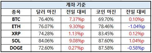 이더리움(ETH)은 달러 마진 76.07%로 9.30%포인트 늘었으며, 코인 마진은 78.46%로 1.04%포인트 하락했다. XRP는 달러 마진 74.28%로 1.13%포인트 상승했고, 코인 마진은 83.45%로 0.12%포인트 증가했다.