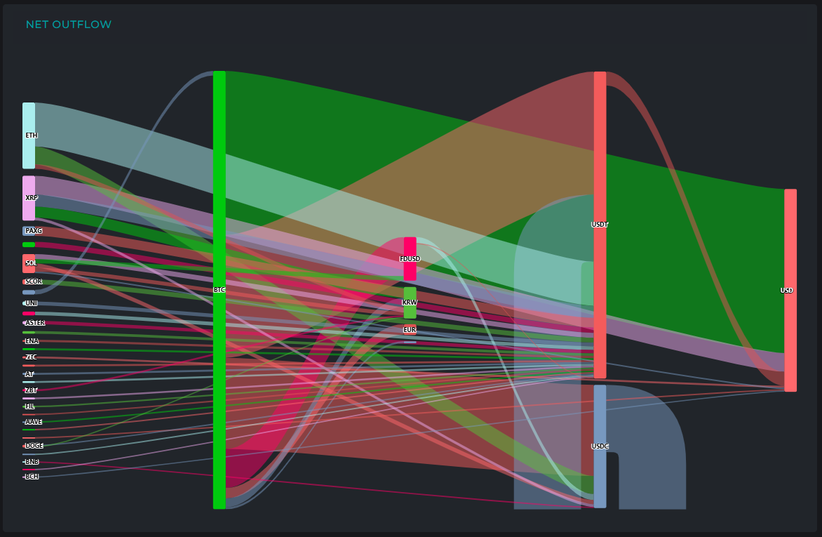 ETH에서도 상당 규모의 유출이 확인됐다. ETH 기반 유출 규모는 총 7150만 달러로 집계됐으며, 이 가운데 ▲USDT로 4500만 달러 ▲USDC로 2230만 달러 ▲원화로 420만 달러가 이동했다. 달러 연동 스테이블코인 비중이 압도적으로 높아, ETH 포지션 축소와 함께 방어적 자산 전환이 동시에 이뤄진 모습이다.