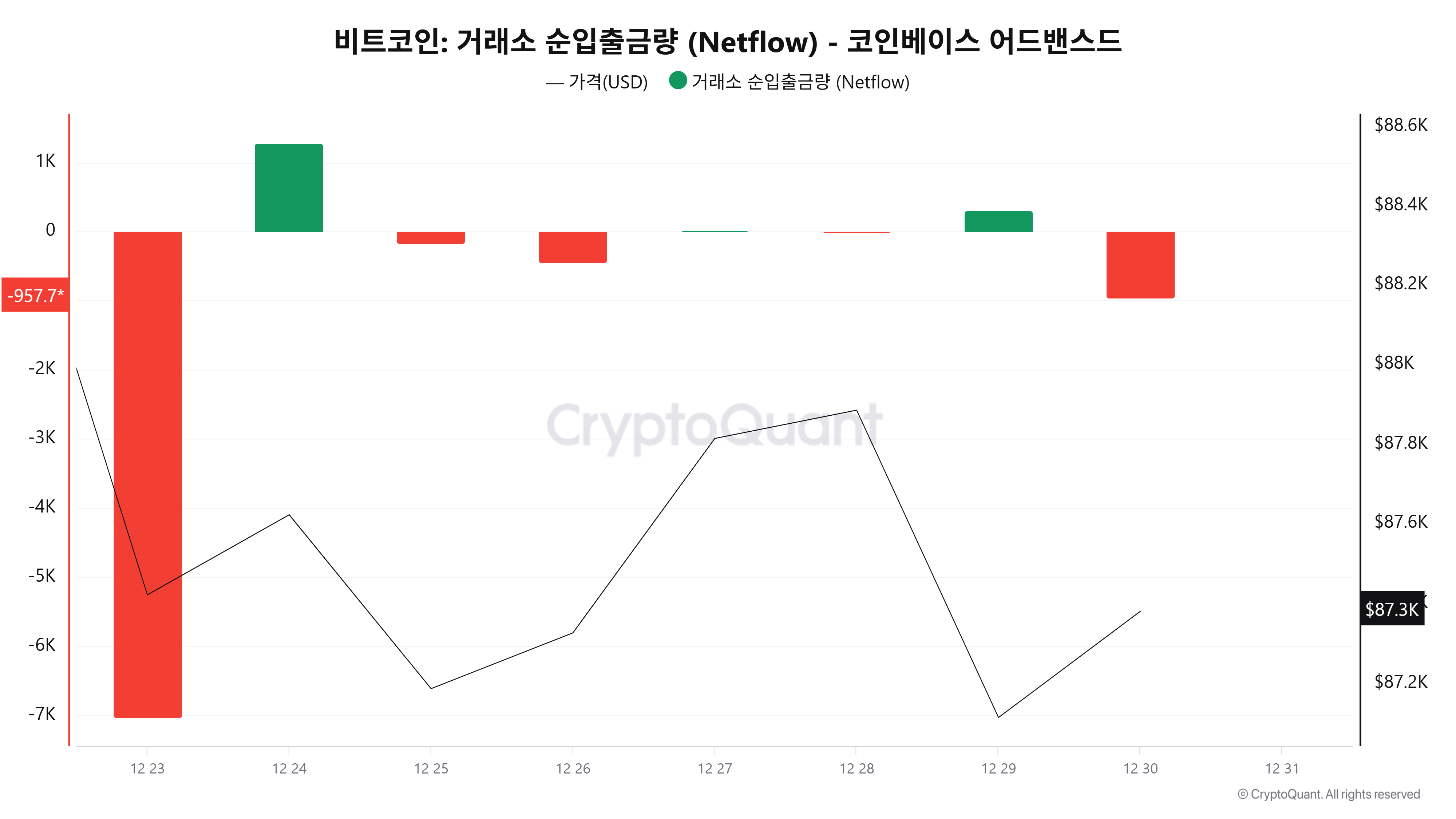 크립토퀀트 데이터에 따르면 12월 30일(UTC 기준, 미완결) 코인베이스 비트코인 순입출금은 –957.74BTC 순유출을 기록했다.