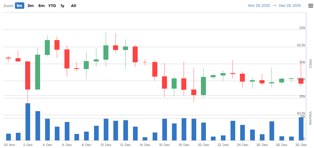 전일 대비 거래량이 급격히 늘어나며 기관 매수·매도 활동이 동시에 활성화된 모습이 확인된다. 특히 12월 28일 대비 12월 29일 거래량이 약 8556BTC 이상 증가한 점은 단기 시장 내 유동성이 빠르게 회복되고 있음을 시사한다. 이처럼 단기간에 거래량이 크게 재확대되는 국면에서는 가격 변동성도 함께 커질 가능성이 높아, 추가 거래량 유입이 추세 강화로 이어질지 여부가 단기 방향성 판단의 핵심 변수로 작용할 전망이다.